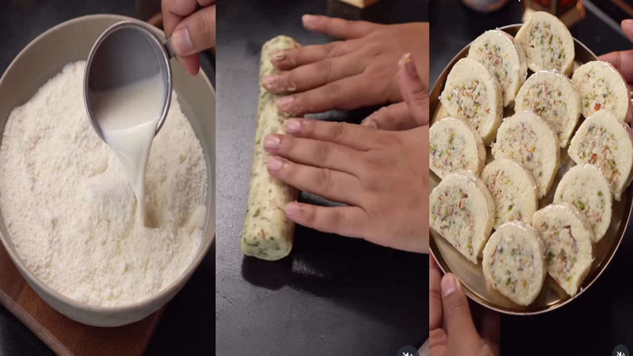 తయారీ విధానం: ముందుగా ఒక గిన్నె తీసుకుని అందులో పాలపొడి వేయండి. తరువాత కొబ్బరి పొడి, పంచదార పొడి, పాలు వేసి చేతులతో బాగా కలపండి. ఈ మిశ్రమాన్ని మెత్తని పూరీ పిండిలా తయారయ్యే వరకు పిసుకుతూ కలుపుకోవాలి. పిండి చాలా మృదువుగా తయారైన తర్వాత.. ఆ పిండి ముద్దని రెండు భాగాలుగా విభజించండి. ఒక భాగం తీసుకుని.. దానిలో డ్రైఫ్రూట్స్ ముక్కలు వేసి బాగా పిసికి.. గుండ్రని రోల్ లాగా చేయండి.
