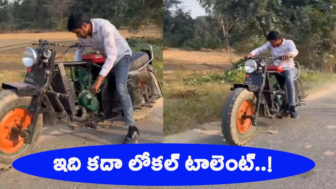 భారతీయులు లోకల్ ప్రతిభతో నిండిపోయారు. వారు తరచుగా తమ టాలెంట్‌తో వివిధ రకాల వస్తువులను సృష్టిస్తున్నారు. అది చూపరులను ఆశ్చర్యపరుస్తుంది. అలాంటి ఒక వీడియో ప్రస్తుతం సోషల్ మీడియాలో వైరల్ అవుతోంది. స్థానిక యువకుడు ఈ టాటెంట్‌ను ప్రదర్శించారు. ఇది అందరినీ నిజంగా ఆశ్చర్యపరిచింది. వీడియోలో , ఒక వ్యక్తి సాధారణ బైక్ ఇంజిన్‌తో సాధారణ చక్రాలు లేని ప్రత్యేకమైన బైక్‌ను నడుపుతూ కనిపించారు. బదులుగా, అతను బైక్‌కు భారీ ట్రాక్టర్ వీల్‌ను అమర్చి, ఇంజిన్‌ను జనరేటర్‌తో భర్తీ చేశాడు.