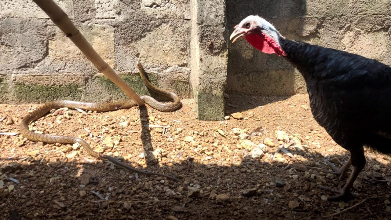 టర్కీ కోడి, గిన్ని కోడి వంటి పౌల్ట్రీ జాతులు పాములతో విభిన్నంగా వ్యవహరిస్తాయి. సాధారణ నాటుకోళ్ల వలె పాములను చూసి భయపడి శబ్దం చేయకుండా, ఈ కోళ్లు మరింత ధైర్యంగా ఉంటాయి. అవి పాముల సమీపంలోకి వెళ్లి, చిన్న పాములను పొడవడానికి ప్రయత్నిస్తాయి, పెద్ద పాములను తమ పరిసరాల నుంచి తరిమికొట్టడానికి చూస్తాయి. టర్కీ కోళ్లు పాములను గమనించి, తగిన అదును కోసం వేచి ఉండి, దాడికి సిద్ధంగా ఉంటాయి. ఇక్కడ కనిపించే టర్కీ కోడి కూడా అటువంటి ప్రవర్తనను ప్రదర్శించింది, శబ్దం చేయకుండా పామును పరిశీలించింది. ఇటీవల ఒక జెర్రిపోతు ఒక పశువుల పాకలోకి ప్రవేశించి, అక్కడ కోళ్లు పెట్టిన గుడ్లను తినేసింది. ఈ సందర్భంలో, దానిని పాకలో నుంచి బయటికి తరలించడం జరిగింది. జెర్రిపోతులు కోడి పిల్లలను లేదా గుడ్లను తిని ప్రమాదకరంగా మారితే తప్ప, వాటికి హాని చేయకూడదు. పర్యావరణ సమతుల్యత కోసం వీటిని బయట, పంట పొలాల్లో సురక్షితంగా వదిలివేయడం మంచిది. ఇది కేవలం పాముకు ప్రాణభిక్ష పెట్టడమే కాకుండా, పర్యావరణానికి కూడా మేలు చేస్తుంది.