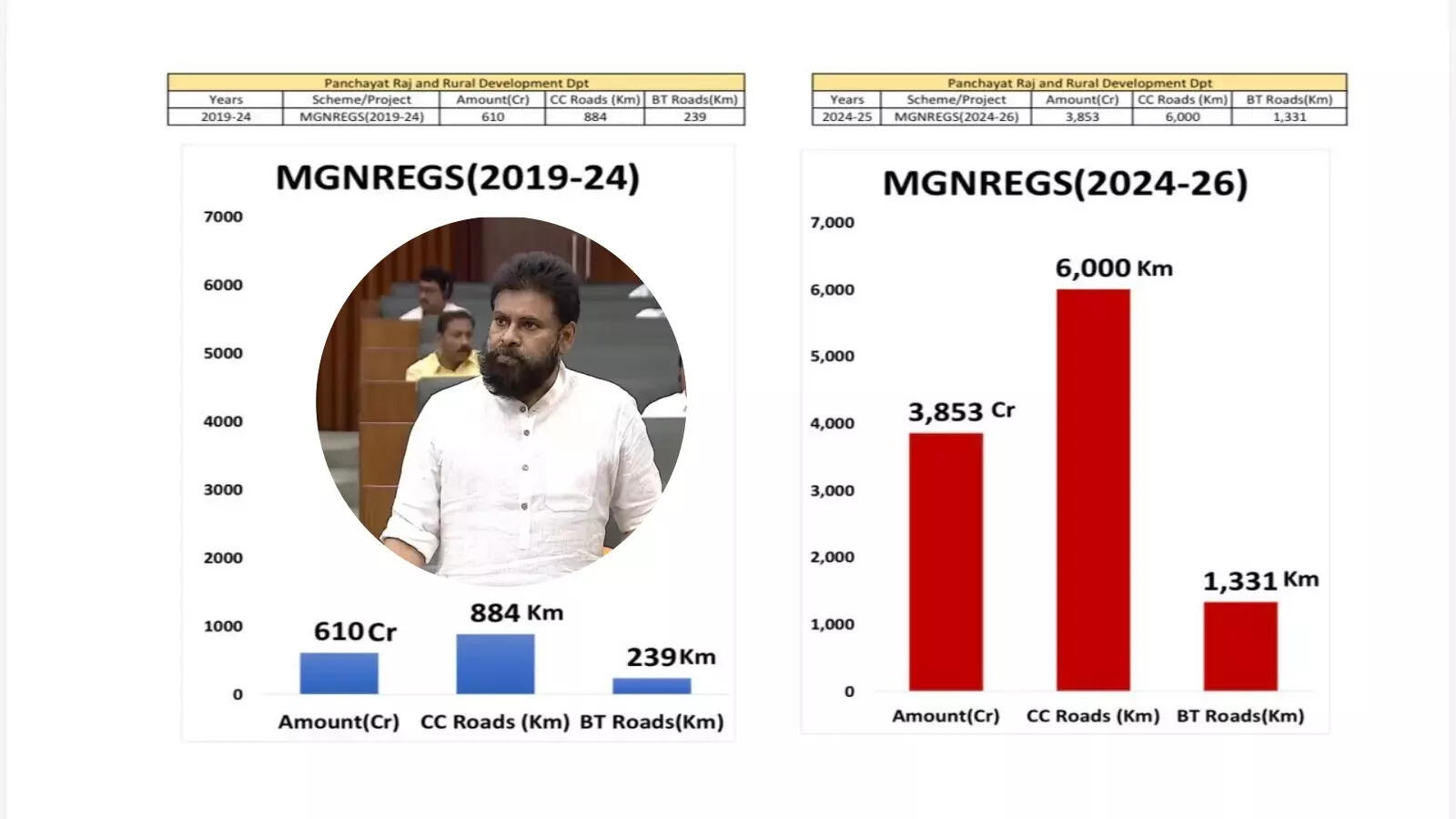 వైసీపీ ప్రభుత్వంలో సీసీ, బీటీ రోడ్ల కోసం రూ. 641 కోట్లు ఖర్చు చేస్తే… కూటమి ప్రభుత్వం అధికారం చేపట్టిన తొలి 20 నెలల కాలంలోనే రూ. 3853 కోట్లు ఖర్చు చేసిందని డిప్యూటీ సీఎం పవన్ కళ్యాణ్ వివరించారు. వైసీపీ ఐదేళ్ల కాలంలో 854 కి.మీ సీసీ రోడ్లు, 239 కి.మీ బీటీ రోడ్లు వేస్తే.. తమ ప్రభుత్వం 6000 కి.మీ సీసీ రోడ్లు, 1331 కి.మీ మేరకు బీటీ రోడ్లు నిర్మించినట్టు వివరించారు.